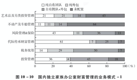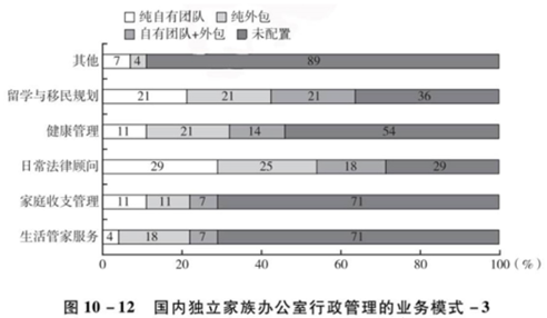 而在家族治理中,主要是依托于家族企业所对应的业务,扮演投融资顾问角色。在行政管理中,家族办公室大体核心业务均会立足于子女的教育及家族日常法律顾问支持。以上为家族办公室的核心业务,在所有家族办公室中均由自由团队进行业务支撑;而其他非核心业务往往会采用外包服务,这也与世界其他地方家族办公室的运行模式相类似(见图10-10 10-11 10-12)。