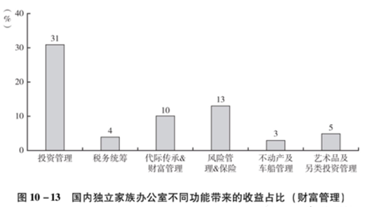 从市场调研结论来看,目前本土家族办公室的主要利润来自财富管理模块中的投资管理,据不完全统计,这部分业务利润占比超过三成,亦说明目前家族办公室的职能定位(见图10-13)。