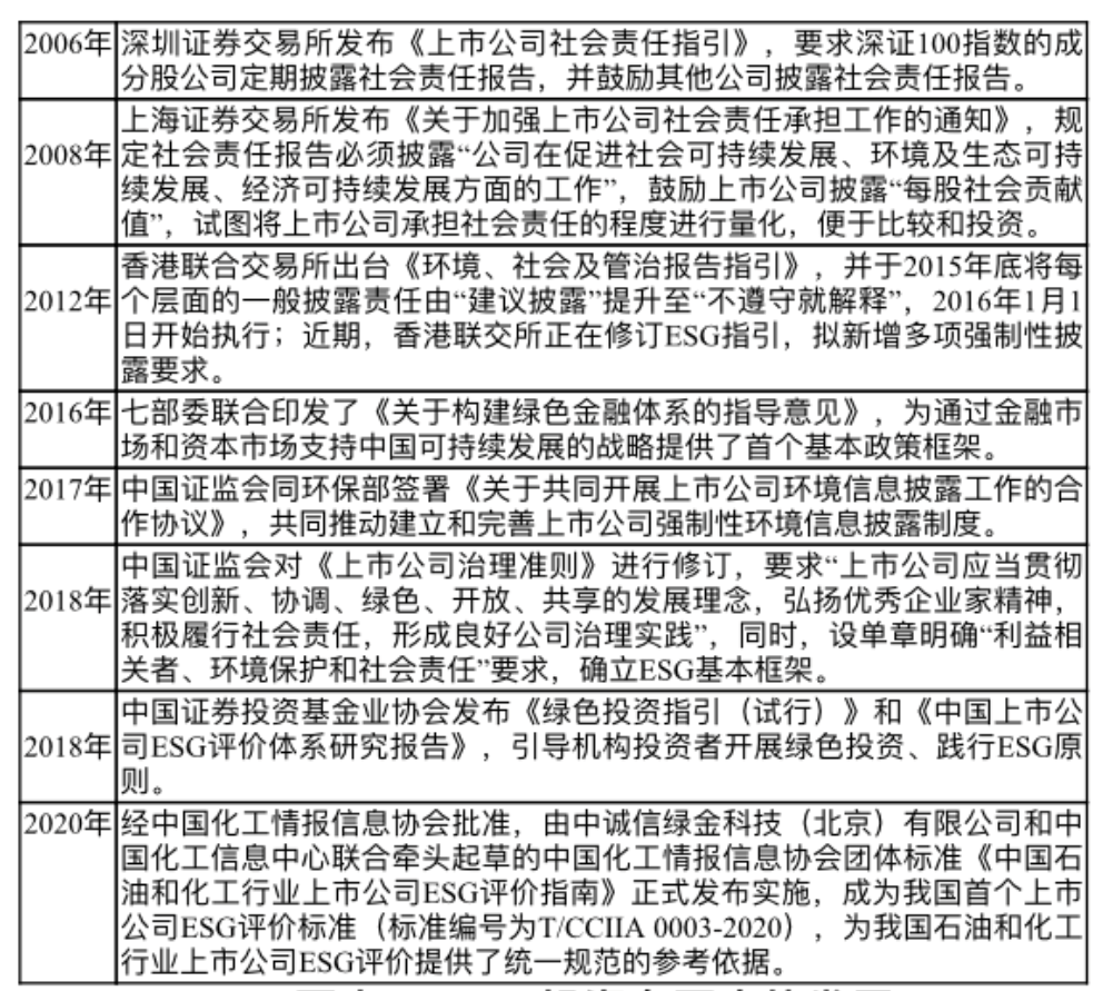ESG作为独立的政策实践话语体系在我国发展起步较晚,但实质上我国改善环境社会、公司治理的努力未曾停止。