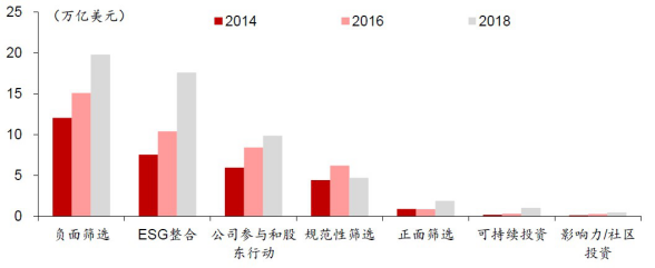 截至2018年底,负面筛选和ESG整合策略使用最为广泛。其中负面筛选策略主要通过剔除高风险公司来降低组合整体风险,2018年该策略管理规模大约为19.8万亿美元,与2016年相比增长31%,是当前使用最广泛的策略。