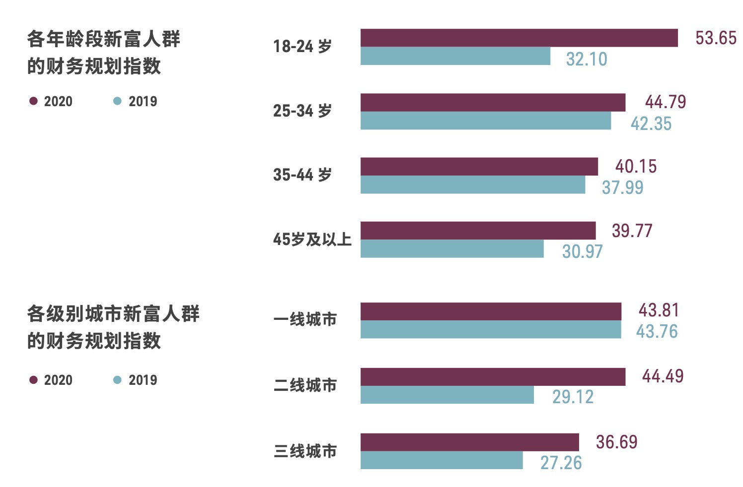 其中,二、三线城市以及较年轻和较年长的受访群体在财务规划方面的改善最为显著。数据显示,二 线城市和三线城市新富人群的财务规划指数较上年分别增长了15.37和9.43。从年龄细分群体来看, 18-24岁的受访者财务规划指数较上年增加了21.55,而45岁及以上的受访者该指数则增长了8.80。