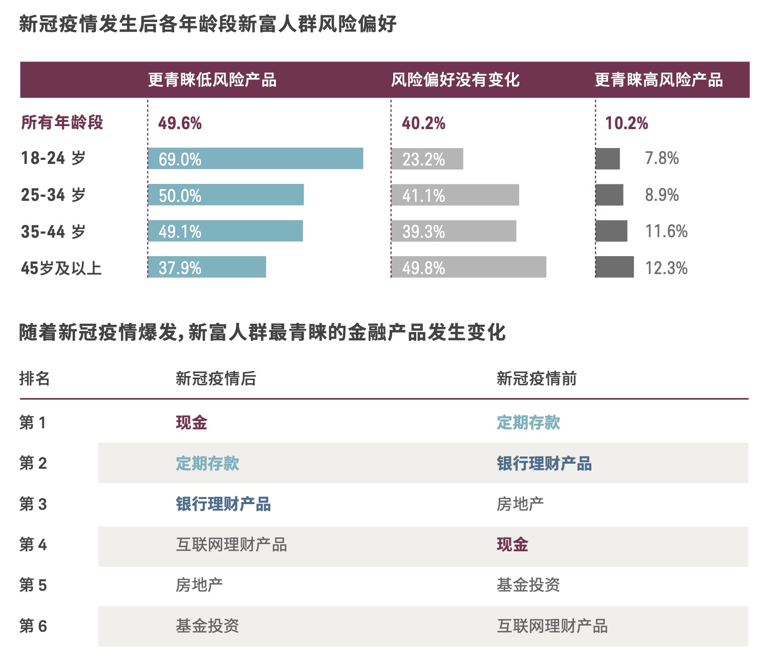 有49.6%的受访者表示,他们在新冠疫情发生后会更倾向于选择持有现金或投资低风险的金融理财 产品。这一转变在18-24岁人群中最为显著,占比高达69.0%。由此,许多新富人群表示他们最青睐的金融产品发生了改变。在此之中,36.9%的受访者表示他们目前最喜欢的理财方式是持有现金,而持有定期存款的受访者占比则较去年上升了4.9%。
