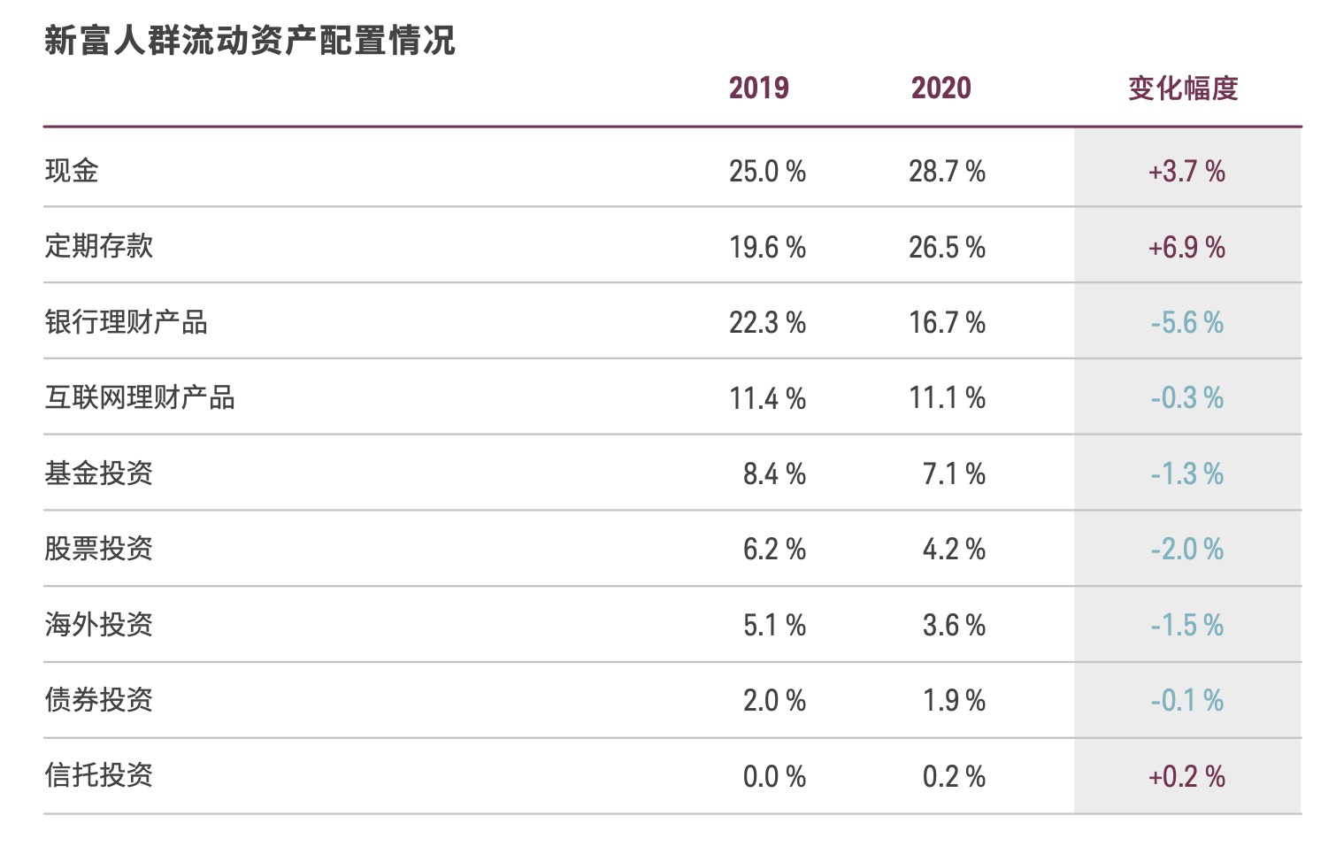 如今,现金和定期存款在中国新富人群的资产配置中占比显著上升。其中,定期存款平均占比上涨了6.9%,而现金的平均占比则增长了3.7%。若将两者相加,其在中国新富人群资产配置中的总占比较 2019年上升了10.6%。