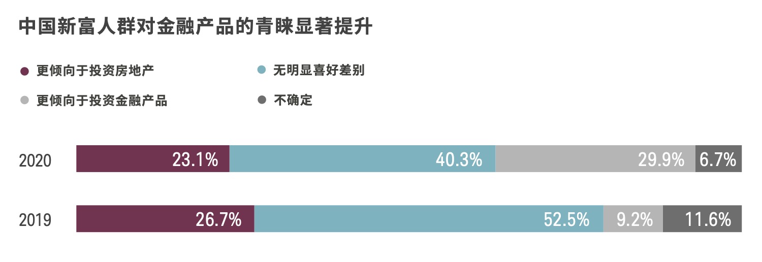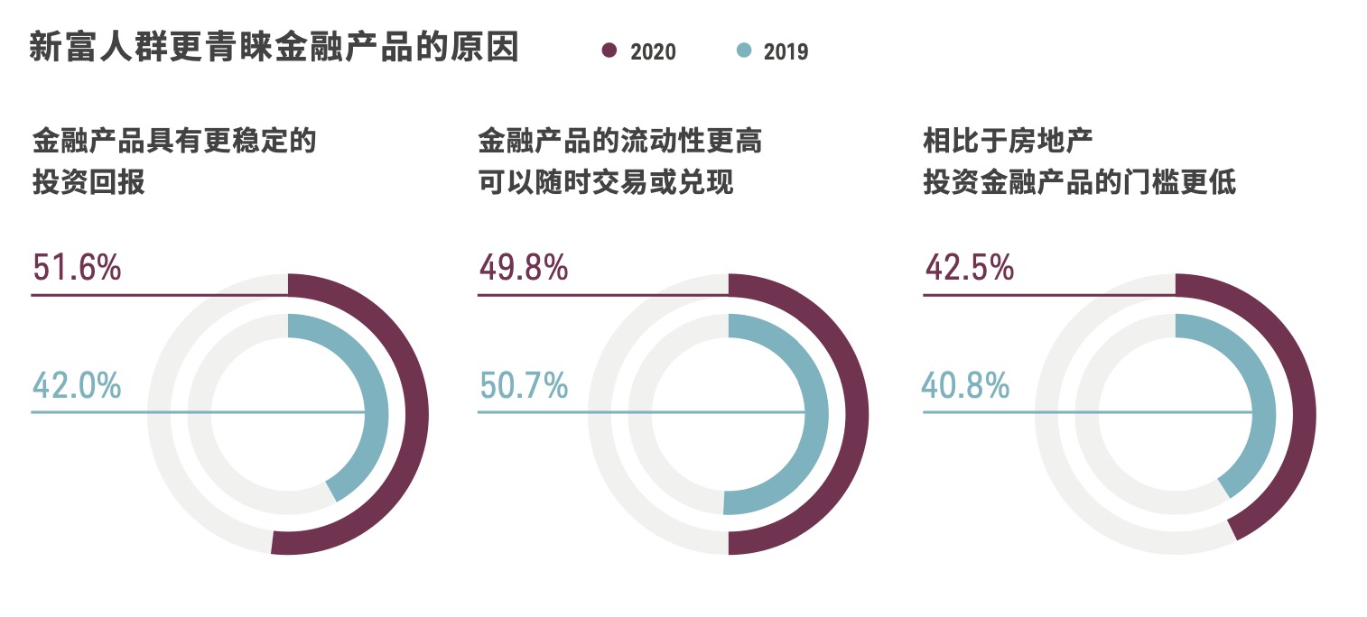 今年,新富人群对资产配置的态度也发生了明显的变化,由过去过度偏好房地产投资转化为更多元化 的资产配置。数据显示,更倾向于投资理财产品而非房地产的新富人群相比于2019年上升了20.7%。 究其原因,在该群体中有51.6%的受访者表示投资理财产品会比投资房地产获得更稳定的回报。持这一观点的受访者较上年增长了9.6%。