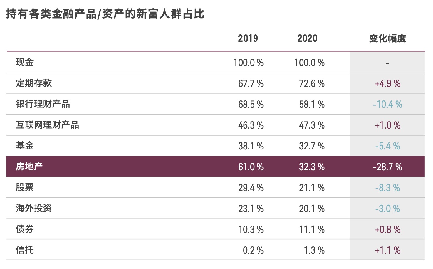 此外,与2019年相比,持有房地产作为投资的新富人群占比下降了28.7%。而以赚取房屋租金作为自己的次要经济来源的受访者占比也较去年降低了23.2%。相反,以金融投资回报作为次要经济来源 的受访者占比则增长了17.1%。