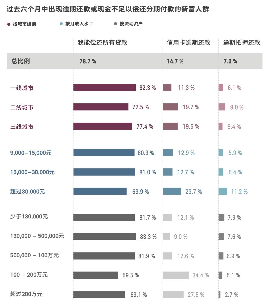 今年的数据显示,这种未来必将带来财富增长的信念可能使新富人群做出令人担忧的、不合理的理财行为。当被问及他们在过去六个月内是否能够按时偿还所有债务时,有21.3%的受访者表示至少发生 过一次逾期还款的情况。其中,月收入超过30,000元人民币的受访者中有30.1%曾出现逾期还款,而在流动资产介于100万至200万元人民币之间的受访者中,这一占比更是增长至40.5%。