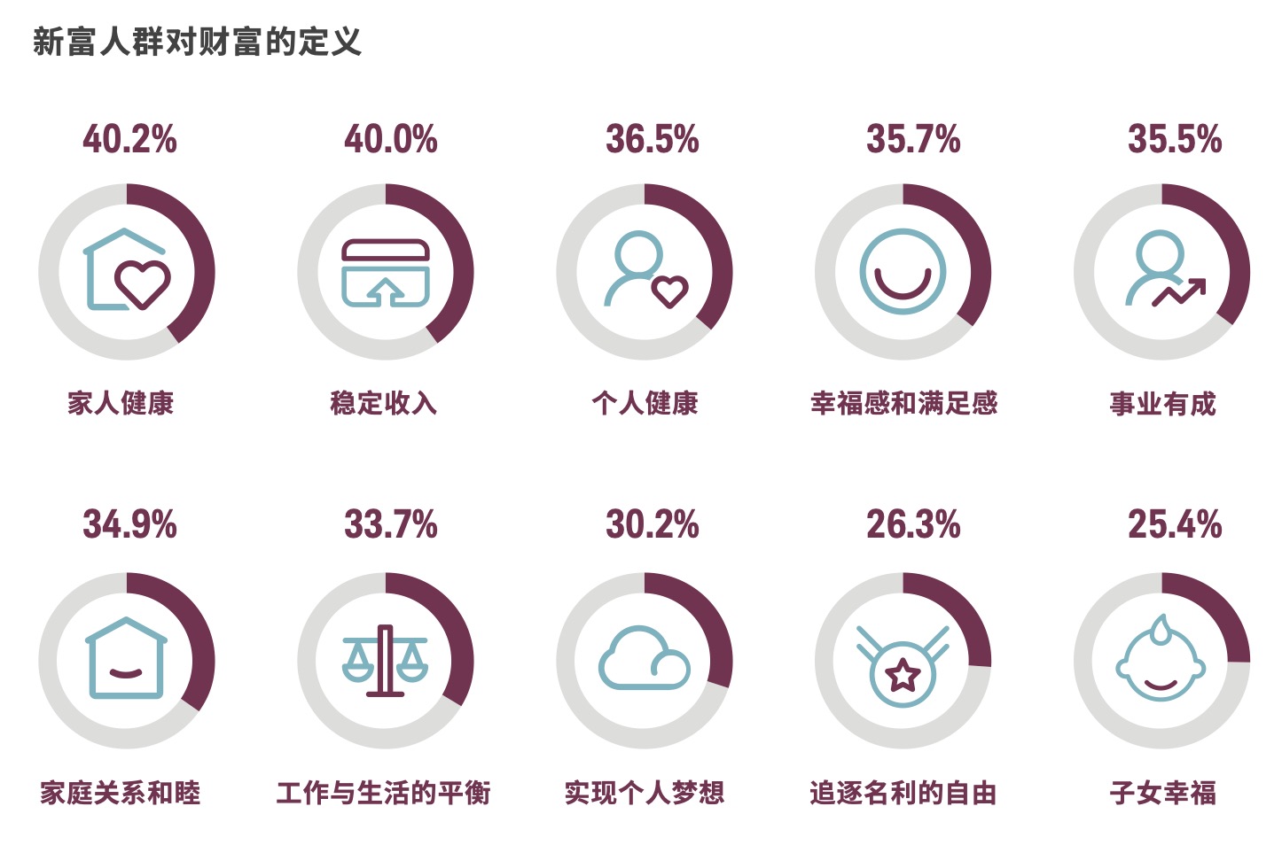 当被问及对“财富”的定义时,许多新富人群将精神以及家庭层面的财富置于物质财富之上,分别有 40.2%、36.5%和35.7%的受访者将“家人健康”、“个人健康”以及“幸福感”视为首要财富。在位列前十的首要财富中,“稳定收入”是唯一一项物质财富。