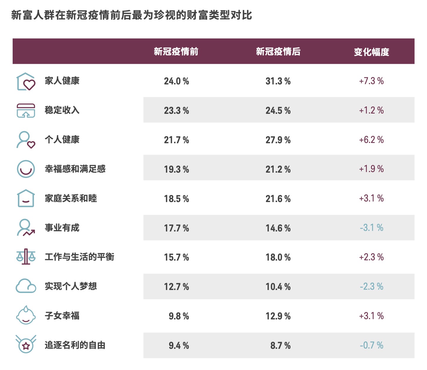 而新冠疫情则在一定程度上加剧了这一趋势。当被问及在新冠疫情之后最看重哪些财富时,受访者再次普遍选择精神和家庭层面的财富。其中,健康被普遍视为最重要的财富,选择“家人健康”和“个人健康”作为疫情后的首要财富的受访者分别占31.3%和27.9%。