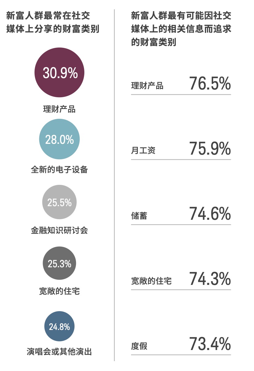 然而,社交媒体的普及似乎正在促使新富人群追求与上述价值观不相符的财富类别,也就是更为追求物质财富。许多受访者表示,他们若在社交媒体中看到家人或朋友分享自己的物质财富,他们对该产品的购买欲会显著上升。具体而言,约有四分之三的受访者称,在社交平台上看到与金融理财产品有关的推荐文章或信息会驱使他们投资该产品。这与会因社交媒体上的相关信息而想要购买豪宅或是进行旅行度假的受访者占比相近。