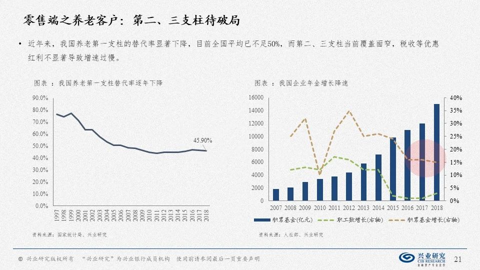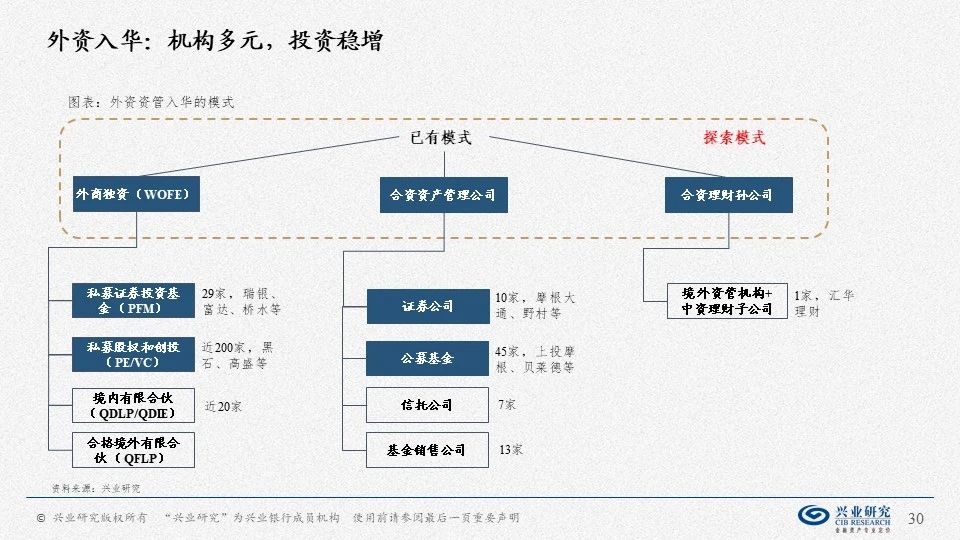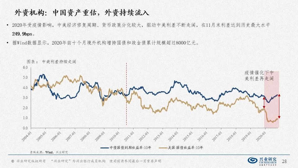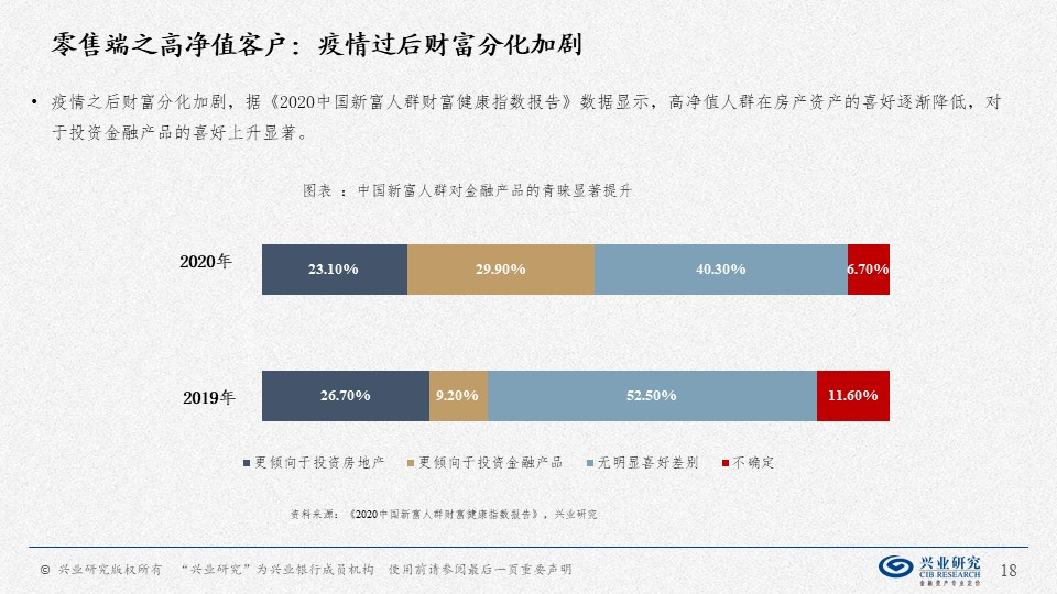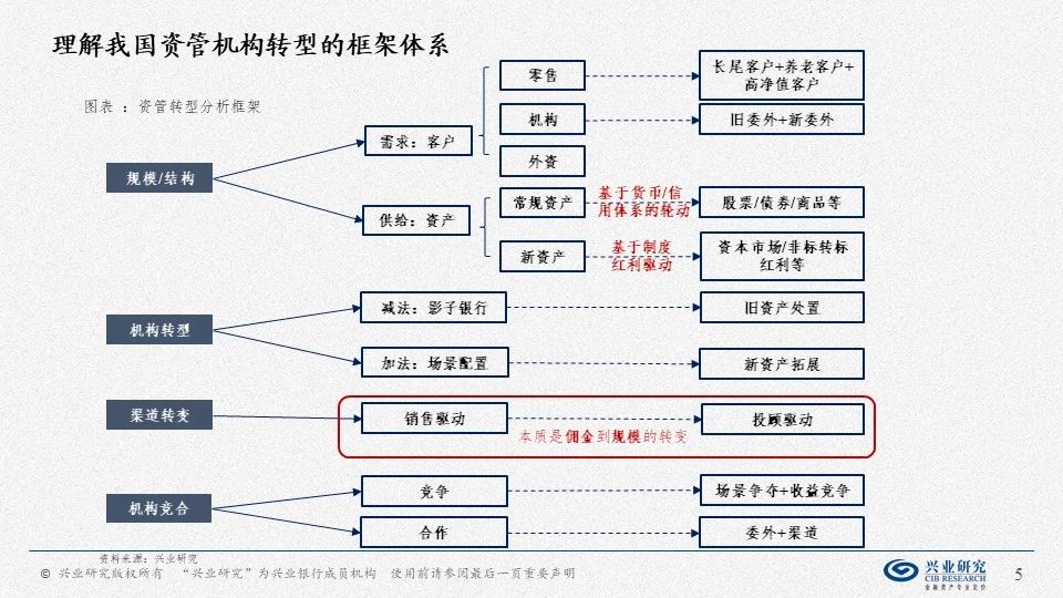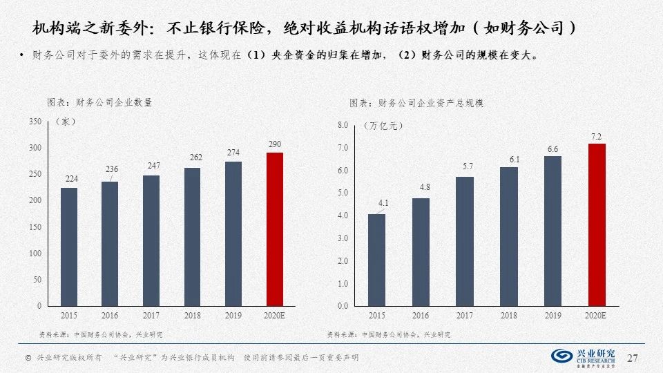 资管需求侧五个调整:(1)长尾客户线上化,追求体验方便和稳定的产品,理财嵌入生活场景;(2)疫情后财富分化加大,高净值客户追求定制化;(3)老龄人群第二支柱和第三支柱待破局,投顾制度和税收递延红利需要加快;(4)严监管下银行表内投资缺额度,税收政策红利不稳定,传统委外退潮;而银行表外(包括近20家理财子公司)、财务公司等追求绝对收益的机构需求在增加,“减非标”“加收益”过程中机构新委外业务在酝酿;(5)海外大水漫灌,人民币资产重估,外资通过WOFE/合资券商/合资基金/理财孙公司等形式配置中国资产。