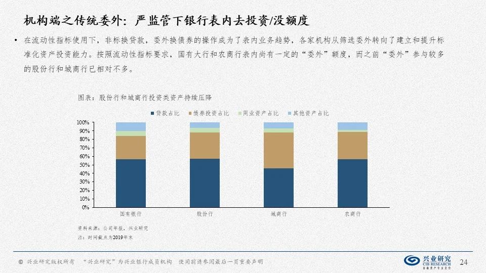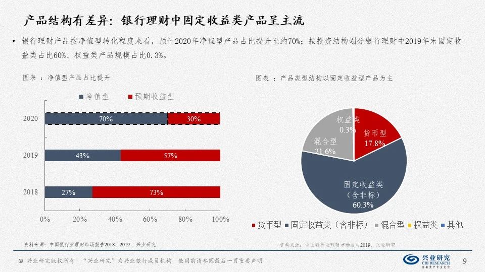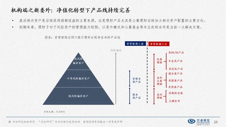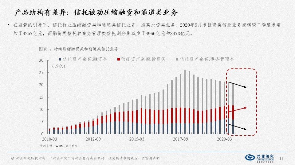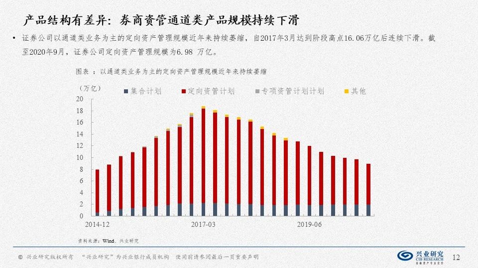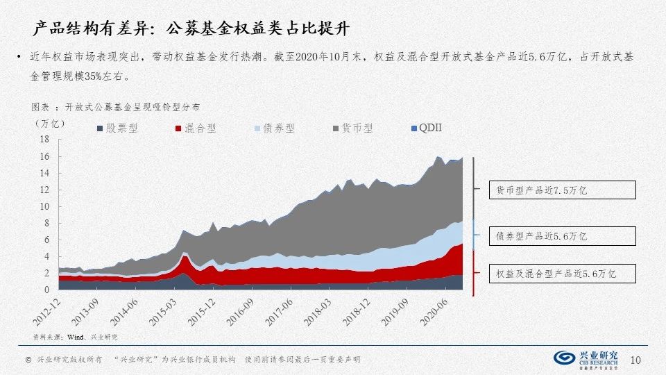 (3)公募扩张/理财稳定/信托和券商资管收缩,产品结构聚焦:银行理财以固收类产品为主;公募基金增量主要体现在权益产品上;信托机构压缩融资业务,券商资管去通道趋势明显。