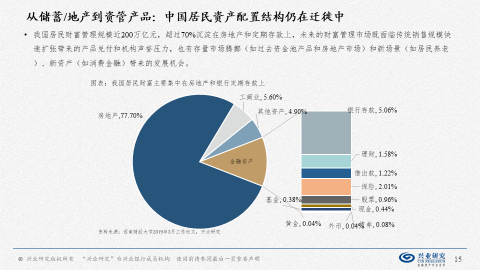 (1)规模已稳三年,财富迁徙正在持续:不考虑嵌套,行业规模稳定在约百万亿元,而我国居民可投资资产规模在200万亿元以上,正从储蓄/地产迁徙至资管产品。