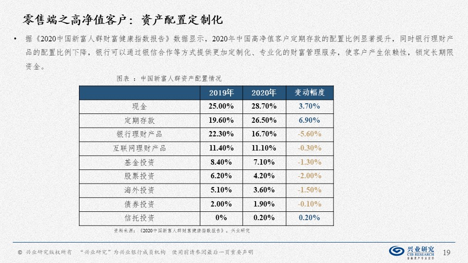 从销售驱动到资金沉淀,渠道重建匹配净值型产品的销售体系。(1)在打破资金池和刚兑过程中,渠道应持续提升“买方属性”,如建立投顾体系,考虑采取“低账户管理基础收费+持续产品推荐”的模式,实现财富收入随客户资金沉淀而增加,减少市场波动和信用周期的影响。(2)2020年4月蚂蚁金服与Vanguard“帮你投”上线后,我国的“线上投顾”已试水。“帮你投”本质是一款买方投顾下的被动类产品销售组合,在收费、配置等方面较以往财富管理模式实现了突破。未来该产品能否持续沉淀客户资金体量,这取决于未来“资产配置”—“指数研发”—“降低成本”的系统化流程机制能否完善。