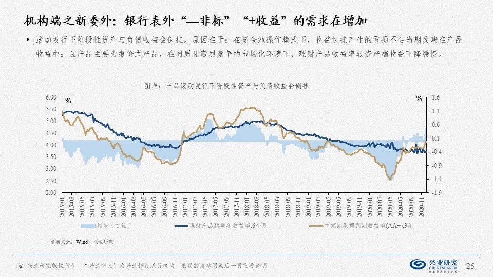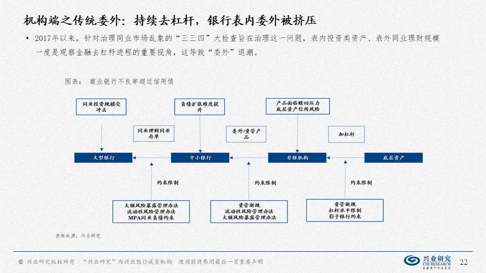 资管机构转型本质是打破以资金池为主的旧循环和构建以净值型为主新循环的动态过程。(1)打破旧循环本质是处置影子银行体系的执行过程。技术层面看,当前处置银行表外旧产品中老资产不存在困难,非标回表、非标转标、表外消化、资产转让、单独诉求均可以成为处置相关资产的有效手段,但相关过程需考虑银行自身资本水平和能承受的成本,同时关注处置节奏对信用环境的冲击。(2)净值型新产品构建依托于具体资管场景。现金管理、财富保值、养老增值、机构理财构建了目前四个基本场景,对于负债久期在一年期以上的资管需求,目前“固收+”策略最具有想象空间,也是资管机构之间合作的突破口。