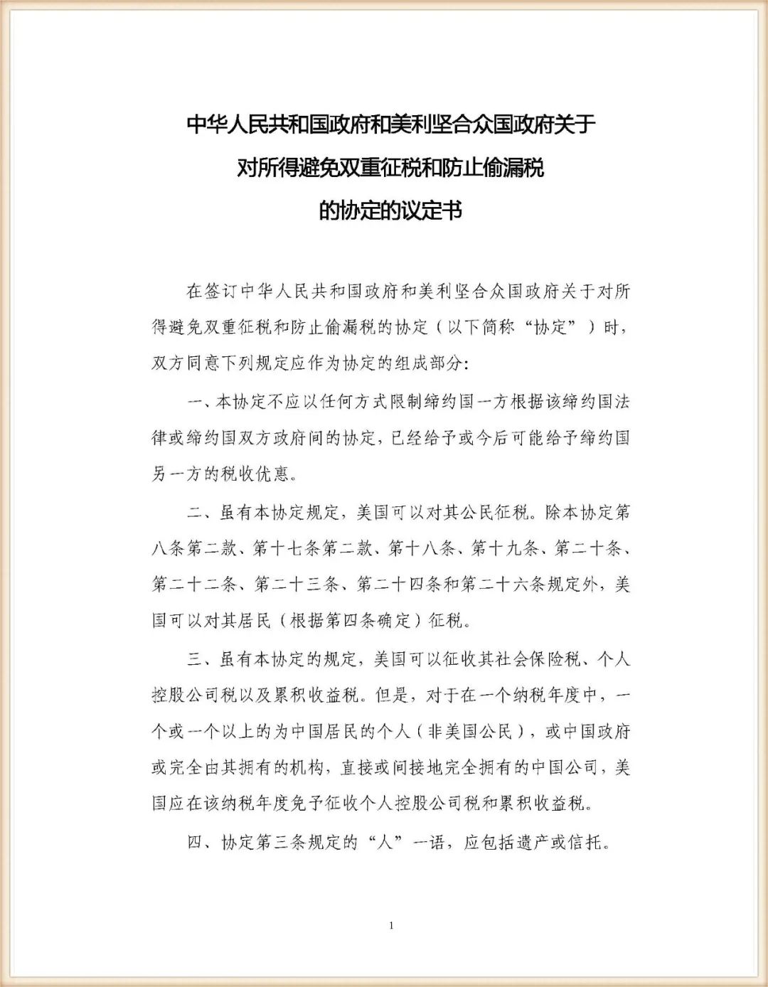 这份议定书我们在大学学习和查阅国际税收协定时,往往都是作为一个极其有战略前瞻性的范本来研究和赞叹。也许今天大家觉得这份议定书总共也就只有八条,薄薄的两页纸,没有什么可赞叹的。但是,设想一下在1984年的中国是怎样的一种税收制度?中国的现代税制就是一个80后,当时的中国刚刚开始改革开放,税制几乎是荒废的,当时的国家正在开始由“利”转“税”的革命性变革。在人们对税还没有任何普及性概念的时候,国家之间的税收协定已经跨越了现代发达税制的所得税和财产持有阶段的遗产和信托,明确了美国这样对其美国纳税人全球征税体制的税制可以全面征收其美国纳税人所得阶段的所得税和财产持有阶段涉及到的遗产和信托。要知道,中国国内有《信托法》已经是2001年10月1日之后的事情了。由此可见,国际税收协定中所展现的智慧和战略前瞻性之强,每次提到,我都会赞叹不已。