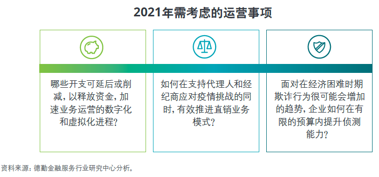 2. 德勤针对全球保险行业高管开展的展望调研发现,各保险公司较疫情之前更为重视成本管理。但是,相比全面削减成本,多数保险公司可能更侧重于部分延缓或缩减疫情之前的投资计划,以释放资金用于优先级更高的项目和人才战略,从而推动企业更快速地调整和适应疫情所带来的影响。