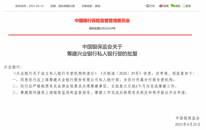 5月11日,银保监会官网公告显示,已同意兴业银行在上海筹建私人银行部,为该行所属分行级专营机构,批筹有效期为6个月。