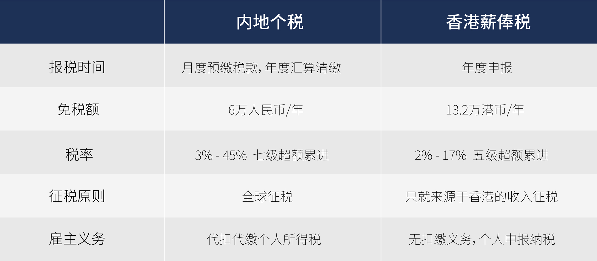 此外,在征税原则上,香港的薪俸税是只就来源于香港的收入征税,内地的居民纳税人需要就来源于全球的收入都申报纳税。