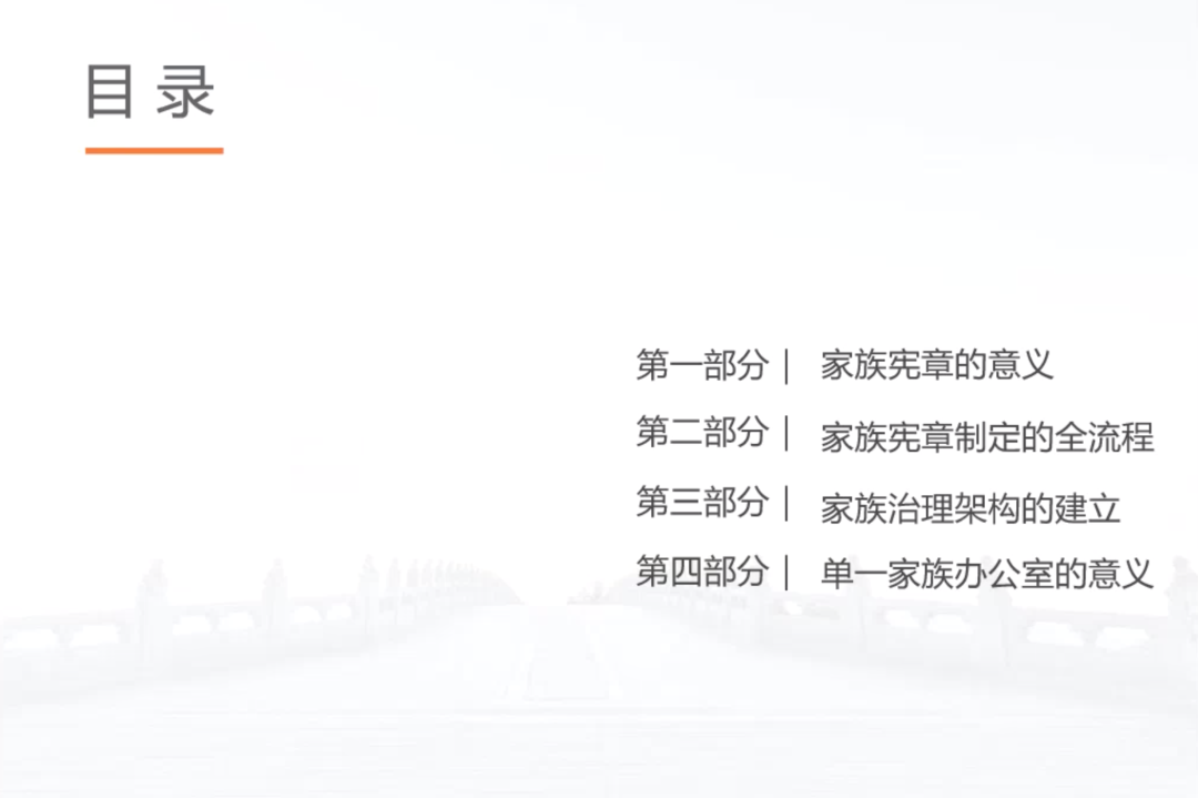 我的分享主要会分为四个板块。第一部分,我们和大家一起探讨家族宪章对于一个大家族的意义。第二部分,我们着重会带大家了解整个家族宪章制定的全流程,并且和大家分享我们在实践的过程当中的一些心得。第三部分,我们和大家简要地介绍一下合理的家族治理架构的初步建立内容和过程。第四部分,我们会简单介绍单一家族办公室的意义。