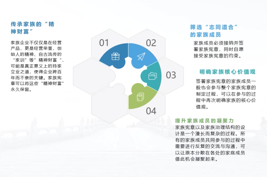 因为我们现在的很多企业家可能更加注重或者是实际的是财富传承,但其实财富传承如果不提不叠加上家族精神和奋斗史的传承的话,可能二代或者是三代在接受了巨额庞大的家族财产之后,反而会迷失了方向,丧失奋斗动力,可能会出现所谓的败家二代或者是二世祖或者是家业传不过三代的魔咒。我们认为,家族宪章的第一个重大的板块,就是要将家史和家族精神整个传承下来。