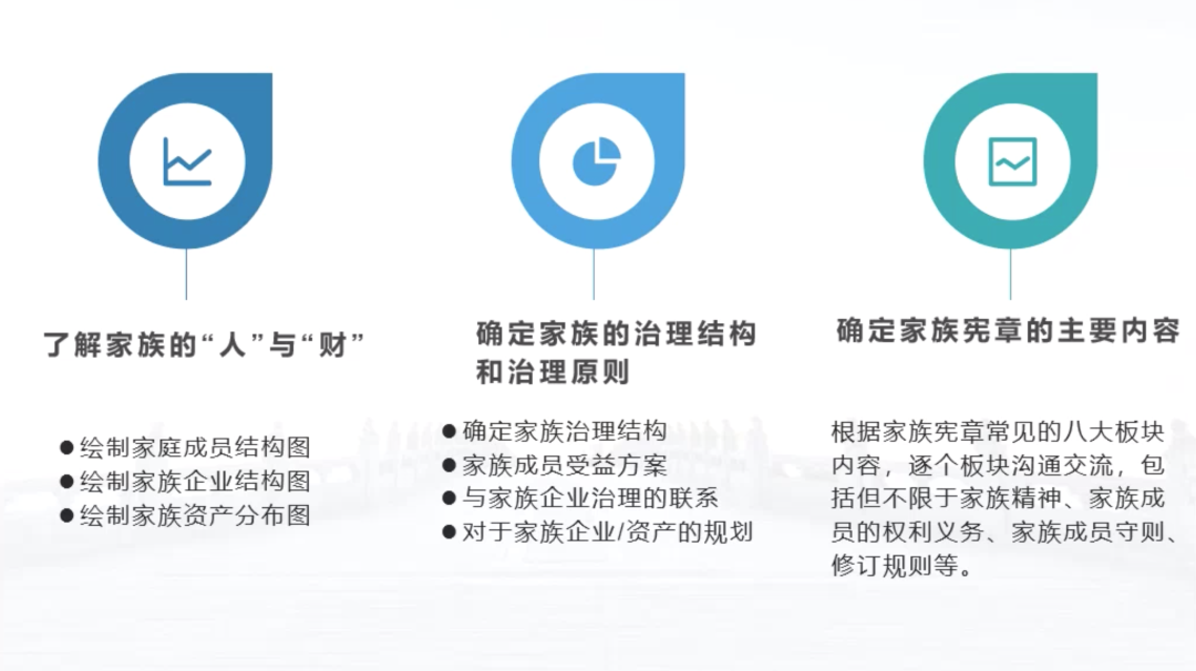 一个家族宪章的制定是怎样的过程?在家族宪章中,我们又应该注意哪些比较重要的板块呢?我们下面进入家族宪章的整个制定流程。