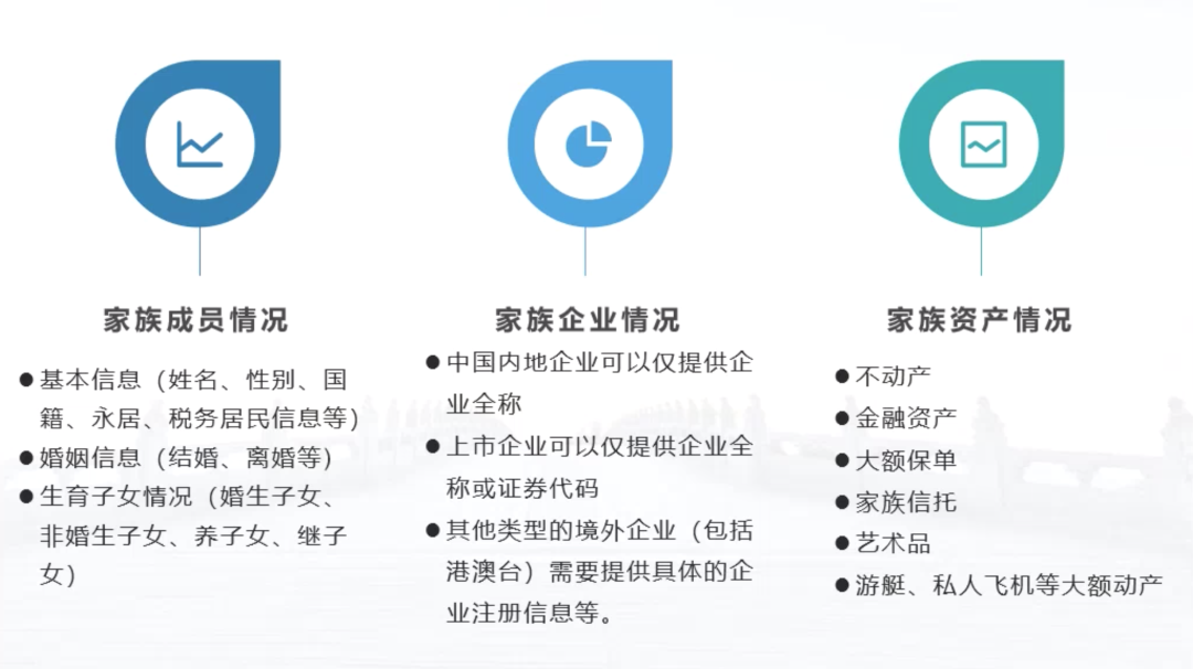 在经过访谈阶段之后,我们对于整个家族的一些情况已经有了初步的了解,我们就要进入再下一个阶段——财产资料的收集阶段。这其实也是围绕着前期访谈阶段展开的,其中包括家族成员的情况——我们前面也做了一个介绍——重要的是一些婚姻的情况,因为婚姻的情况可能会涉及到家族成员的财产分配,包括生育子女的情况尤其是大家族的成员当中可能会存在一些非婚生子女或者是继子女。这个可能是未来会涉及到家族财富传承的异议。