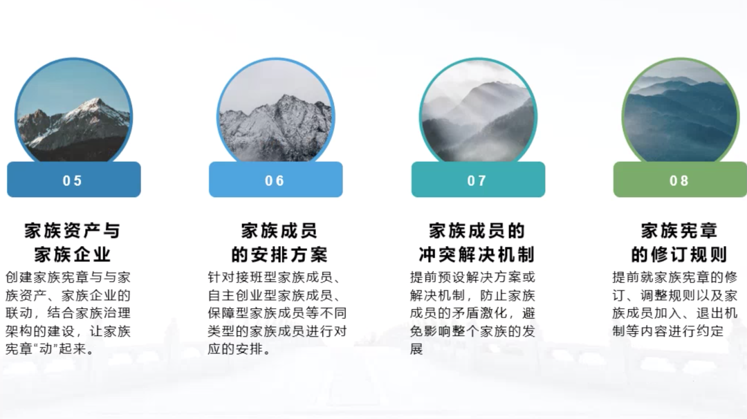 第四个板块是家族治理结构,主要是配套家族宪章和家族企业以及家族资产进行联动。这样就能把家族宪章当中的部分内容转化成法律用语或者是具有法律强制力的文件,嵌入到家族企业的治理以及家族资产的管理当中。这个时候,家族宪章和整个家族企业家族资产就会有一个比较好的联动的状态。