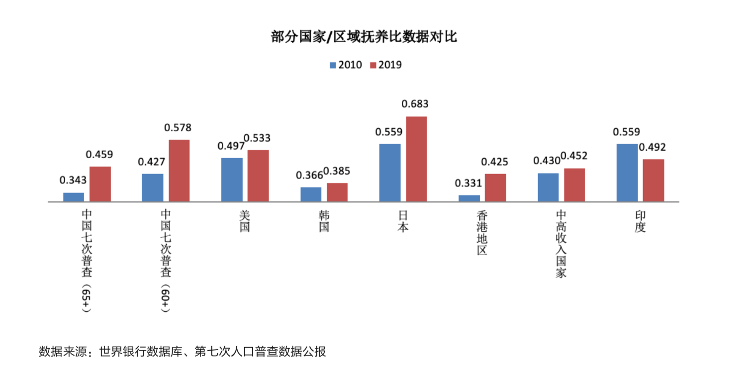 值得注意的是抚养比这个指标,国际上定义抚养比是被抚养人口(15岁以下或64岁以上人口)与劳动年龄人口(15-64岁人口)之比。数据体现为每百名劳动年龄人口中被抚养人口所占的比例。抚养比越高,说明该国的劳动人口需要抚养的非劳动人口越多。人口普查数据显示,目前我国的抚养比达到了0.459。与全球部分国家的数据比较,韩国的抚养比为0.385,美国为0.533,日本则达到了0.683。
