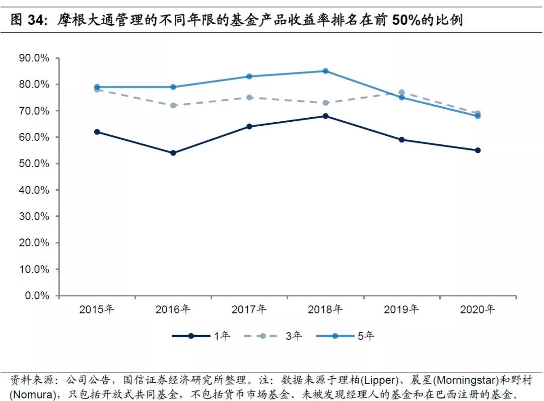 指标2:所管理的基金收益率排名在前50%的百分比,摩根大通该比例长期在50%以上,且持有时间越长收益率越高,表明长期投资能力优秀。截止2019年末,摩根大通管理了一年、三年和五年的基金收益率排名在前50%的比例分别是59%、77%和75%,2020年上述比例分别下降到55%、69%和68%,但仍处在高位。
