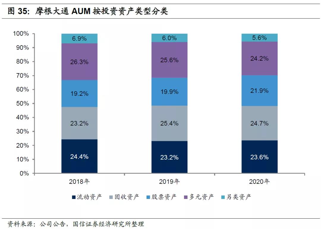 摩根大通财富与资产管理板块资产配置多元化且配置相对均衡。2020年末公司管理资产配置流动性资产、固收资产、股票资产、多元资产和另类资产的比例分别是23.6%、24.7%、21.9%、24.2%和5.6%。同时,公司随时根据市场情况积极调整资产配置战略,如2020年权益市场表现优异的环境下,公司配置股票资产比例较2019年末提升了2.0个百分点。