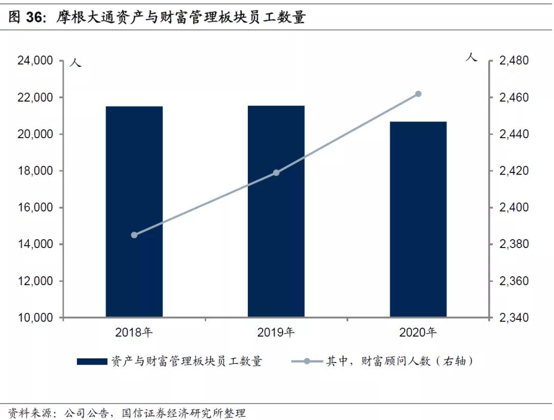 摩根大通非常重视私人银行业务,为了更好的服务私人银行客户,公司前期建立了六对一的私人银行一体化团队覆盖模式,为每个客户配备了专门的客户经理、投资顾问、融资顾问、财富规划顾问、信托顾问和日常服务专员。在摩根大通一体化团队服务模式中,私人银行团队的前中后台每个成员都可以和客户直接见面咨询,每次互动结果都需在团队内分享。这与传统的私人银行模式中只有客户经理和客户面对面交流相相比较,摩根大通一体化团队服务模式能更好的了解客户的需求,提供符合客户需求的产品和服务,增强与客户的黏性。同时,除了六对一的团队之外,摩根大通还配有额外的投资解决方案团队和增值服务团队,以更好地服务超高净值客户的多元化、定制化需求。摩根大通服务高净值客户的财富顾问人数明显多于美国银行,2020年末摩根大通财富顾问人数为2462人,占财富与资产管理板块员工数量的11.9%,美国银行财富顾问人数为2042人,占全球财富与投资管理部门员工数量的9.6%。