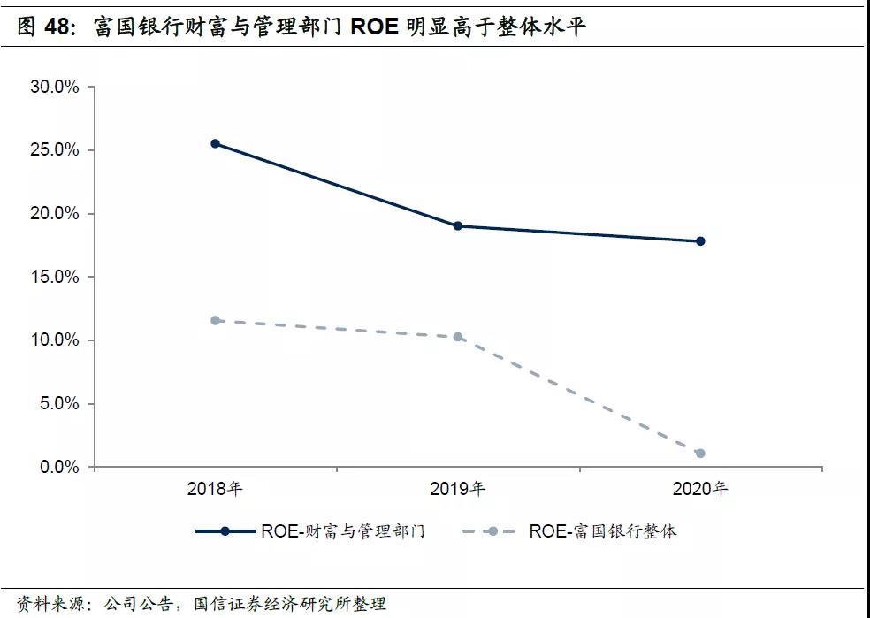 海外银行经营数据也证明了财富管理业务是一项利润率高、资本占用低、稳定性强、护城河高的业务,摩根大通和美国银行财富管理板块ROE长期以来明显高于公司整体ROE水平,且财富管理业务与投行业务等其他业务板块协同发展,给公司带来了非常大的综合收益。
