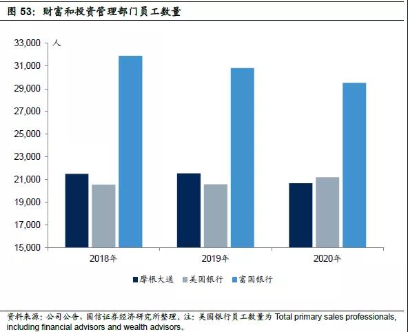富国银行财富管理部门依靠其庞大的人才队伍以及广泛的营业网点来拓展财富管理业务,营销能力是公司核心优势之一。富国银行财富管理部门客户资产规模低于摩根大通和美国银行,但财富管理部门员工要远超摩根摩根大通和美国银行。2020年末富国银行、摩根大通和美国银行财富管理部门员工分别为2.95万人、2.01万人和2.12万人。