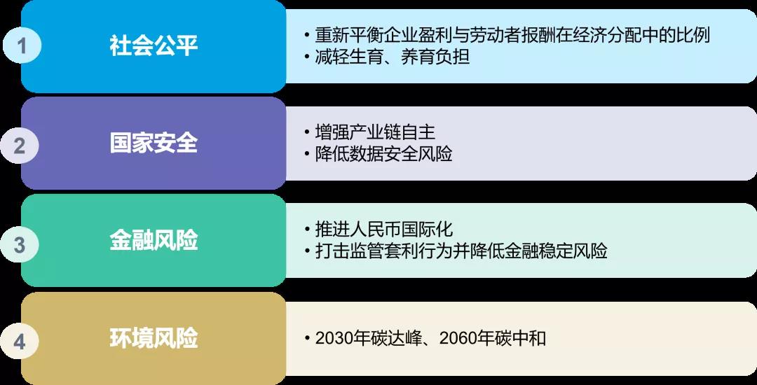 导言:目前正值中国经济和资本市场历史的一个重要转折点。经过过去十年的较高速增长、脱贫攻坚战取得了全面胜利之后,企业巨头化、收入差距扩大逐渐成为中国和全球各国面临的共同挑战,再叠加逆全球化和人口老化的影响,中国正在革新经济治理框架,从实现“小康社会”阶段的增长优先,转向“共同富裕”时代力图平衡增长和安全,政策的优先级转向社会公平、数据安全和产业链自主可控。这一框架对于企业和市场意味着什么?