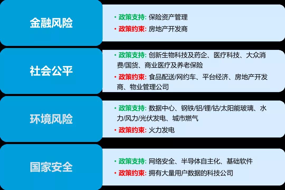 从行业角度看,笔者预计,那些导致收入差距扩大、社会焦虑加剧、环境污染加重,以及有数据安全风险的行业和商业模式,或将在今后数年受到进一步约束。针对科技企业、平台经济以及房地产的监管或将持续。相反,与国家战略方向一致的行业,如国产大众消费品牌、硬件科技自主化、网络安全、创新药、职业培训、新能源产业等仍将获得政策支持。