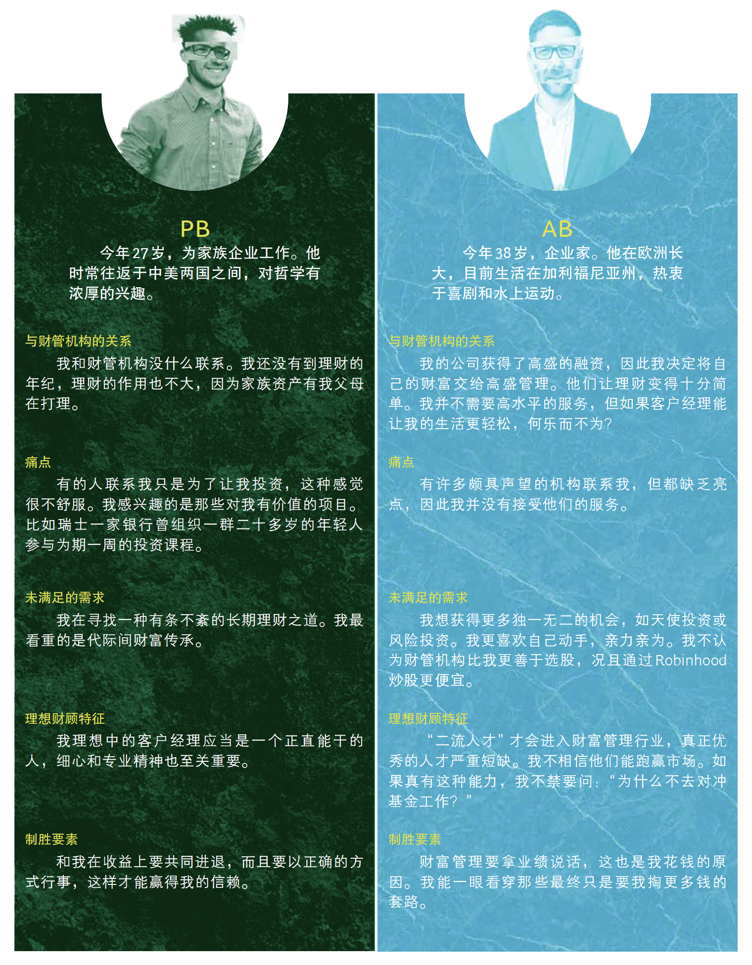 新生代客群常常抱怨太多客户经理在会见客户时总是使用通用型演示文件,即便是最著名的银行也未能免俗。新生代客群在接受访谈时反复提及这一点,BCG对财富客户诸如此类的抱怨也早有耳闻。然而,财管机构仍旧自行其是,未曾改变。