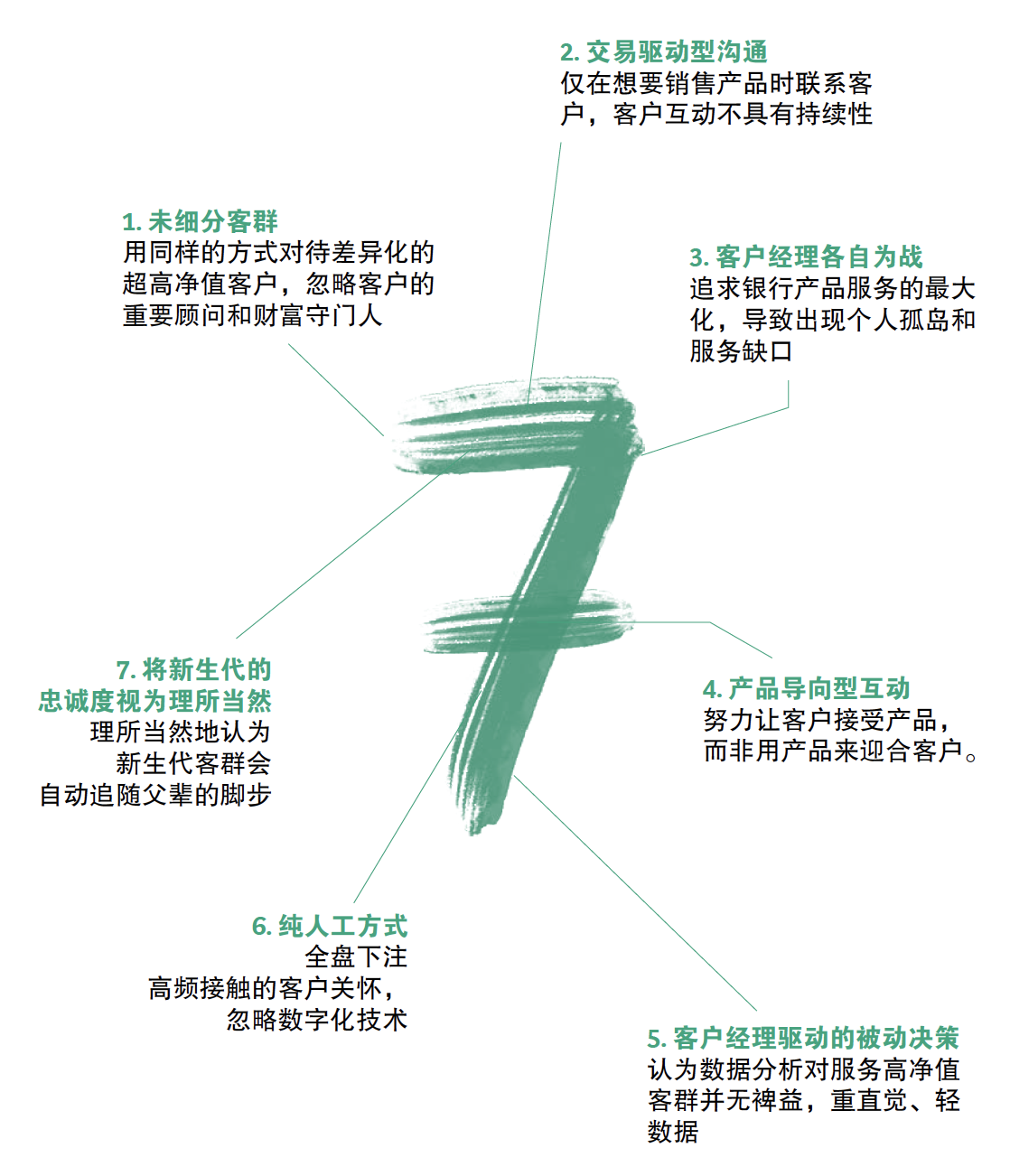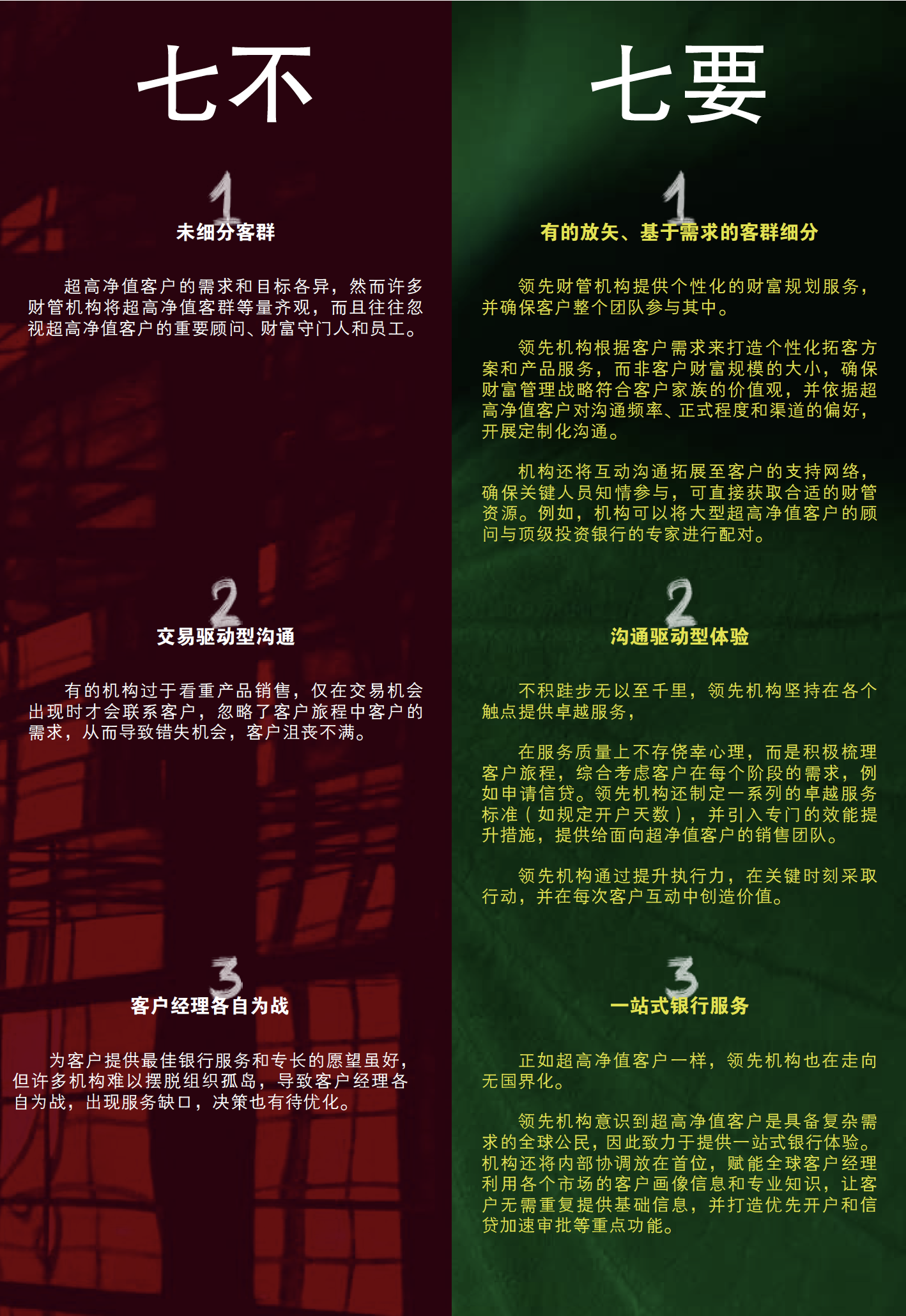 这两种制胜之道皆大有可为,但财管机构需要避开七大常见误区(参阅图7)。展望未来五年,领先机构将坚持“七不七要”原则,在超高净值市场出奇制胜: