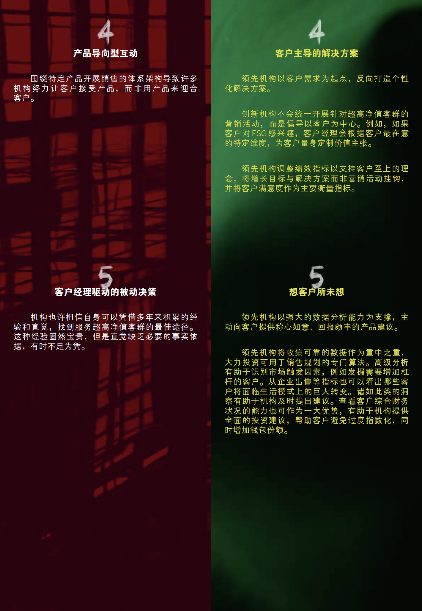 超高净值客群对财管机构的期望也日新月异。影响力投资和另类投资等几年前看似业内领先的产品,现在看来恰似明日黄花。机构需提供高度差异化的服务来满足客户需求,全渠道访问和丰富的数字化功能也已然成为标配。