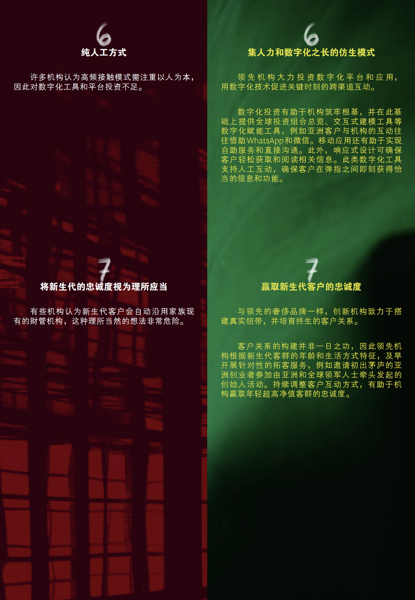 新生代客群乐于在财富管理旅程中独自摸索尝试,对于选股等自认为游刃有余的理财环节,他们并不愿意为此支付高额费用。他们看重的是财管机构绝无仅有的服务和能力,例如独家投资机会、专业的借贷产品及投资专长。从高价值另类投资、交易机会、私募融资到定制信贷,不一而足。其他例子还包括向创业者发放以父母股权作为抵押的首次贷款。