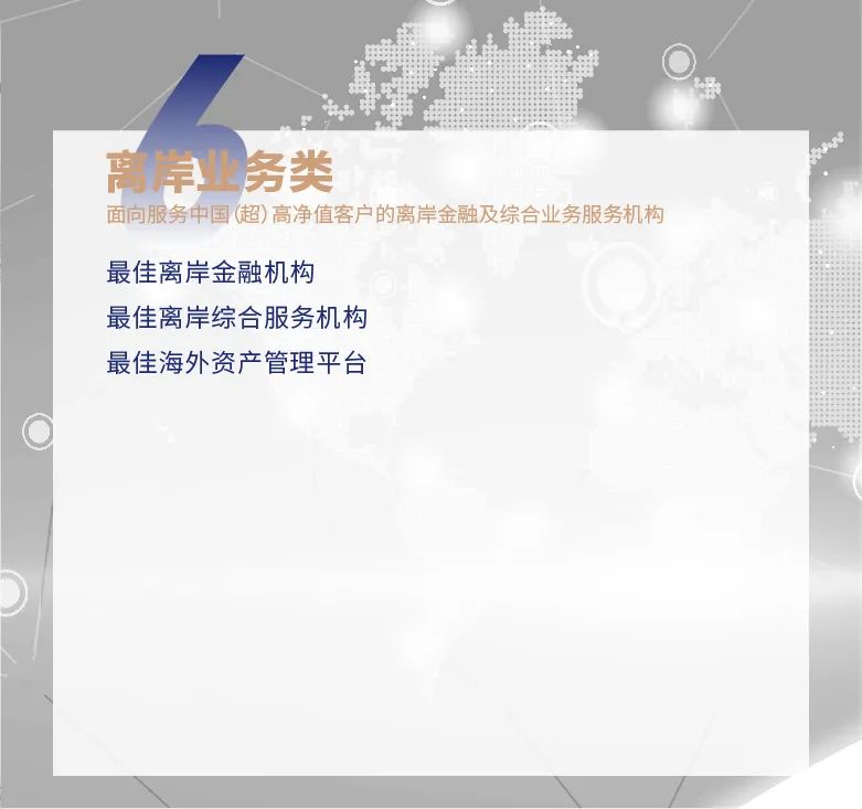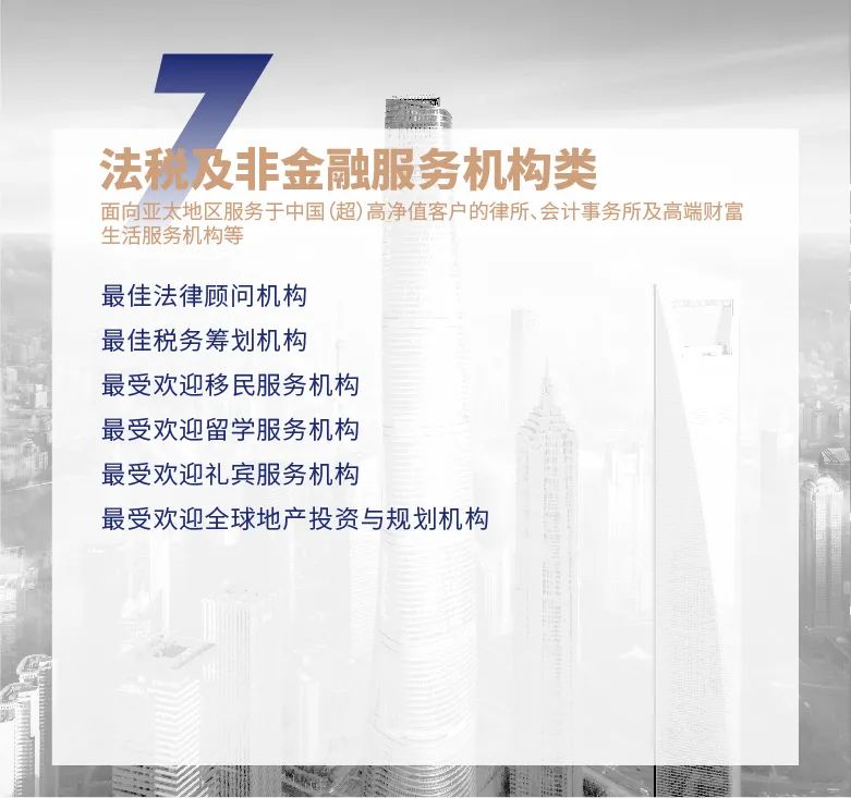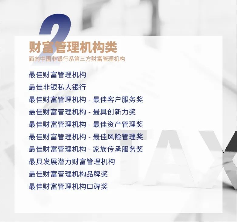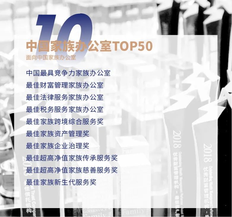 ★ 原家族办公室类调整为“中国家族办公室TOP50”,设有全国总榜单及单项奖。单项奖在原有基础上新增金融服务、家族资产管理、家族企业治理、家族新生代服务等奖项。