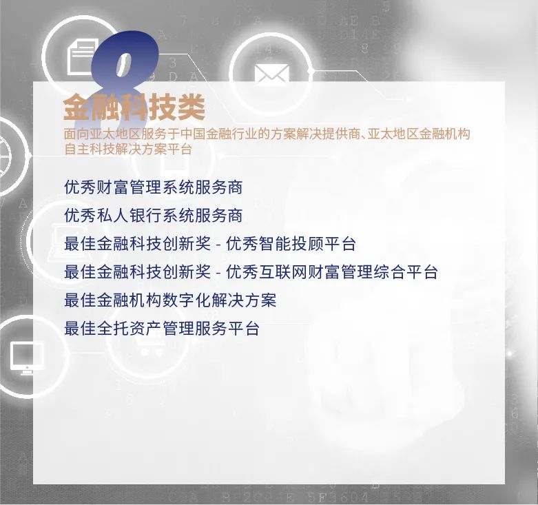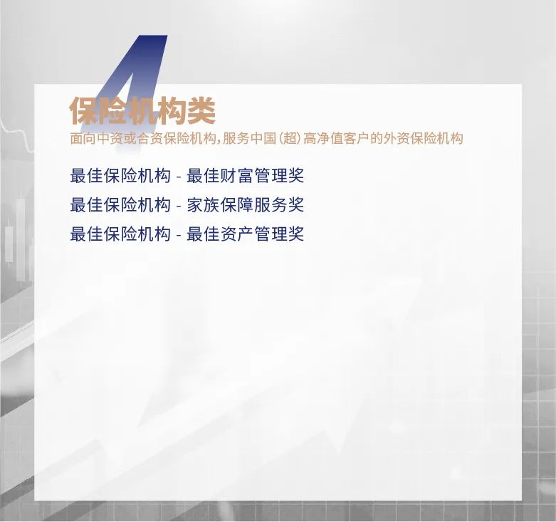 - 个人:从业者仅限于首席财富顾问奖;高管可选择领袖人物奖