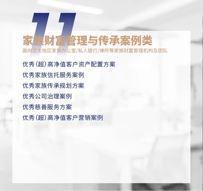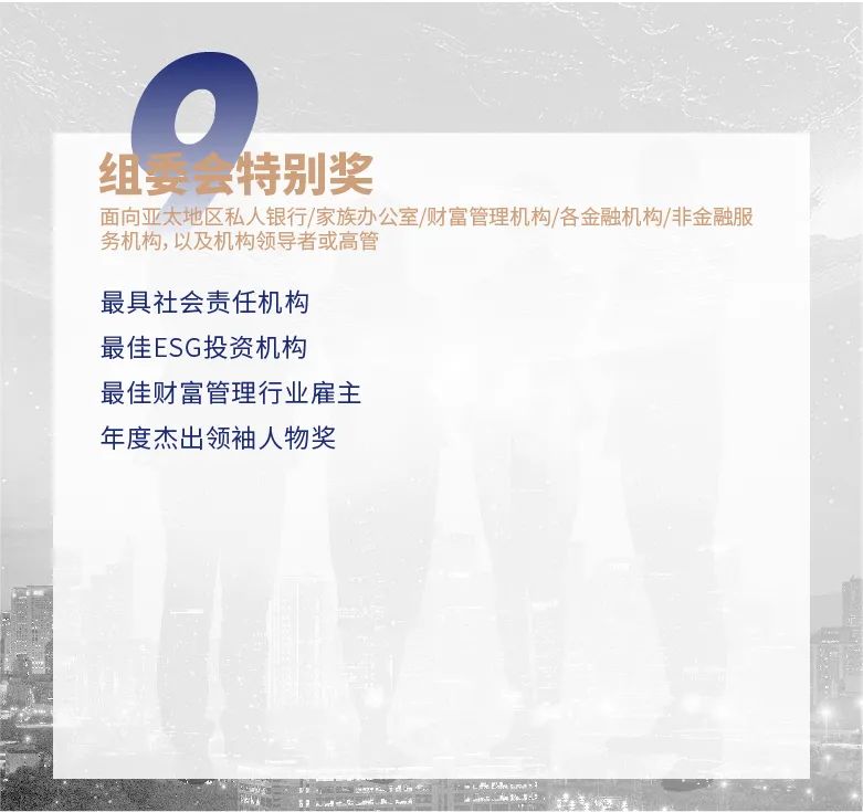作为亚太地区定位卓越财富管理机构的风向标、财富管理行业监管单位考察评定行业创新进展和广大从业者执业成果的重要途径和参考,第六届亚太财富论坛旗下品牌之一的国际私人及家族财富管理行业评选正式开启2021年度奖项申报,旨在褒扬年度杰出机构团队、树立行业头部和标杆、挖掘具有高成长价值的共识。欢迎各大财富管理机构、团队及从业者关注并参与。
