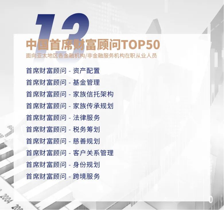 ★ 原优秀个人奖单独为新大类“中国首席财富顾问TOP50”,旨在挖掘并表彰业务能力突出者,设有全国总榜单及单项奖。评选维度包含在岗时期定量和定性考察,提高从业者最佳实践与表现的权重。