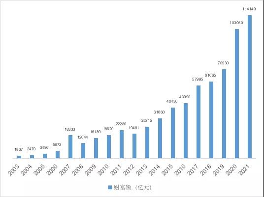过去20年,中国经济强劲增长,上榜富豪们的财富总额也快速上升,2021年上榜富豪财富总额是2003年的近60倍。