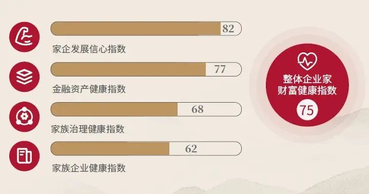 报告指出,2021年工银企业家财富健康总指数得分为75分,体现出新时代背景下中国企业家整体财富健康的良好状况。具体由以下四个子项构成:
