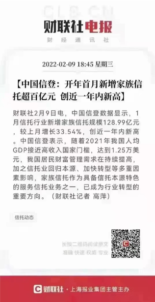 2022年2月9日下午6点45分,上海报业集团财联社发布了一则主题为【中国信登:开年首月新增家族信托超百亿元 创近一年内新高】的简讯,主要内容为:中国信登数据显示,1月信托行业新增家族信托规模128.99亿元,较上月增长33.54%,创近一年内新高。中国信登表示,随着2021年我国人均GDP接近高收入国家门槛,达到1.25万美元,我国居民财富管理需求在持续提高,加之信托业回归本源、加快转型等多重因素影响,家族信托作为具备信托本源特色的服务信托业务之一,已成为行业转型的重要方向。”瞬间刷爆了朋友圈。