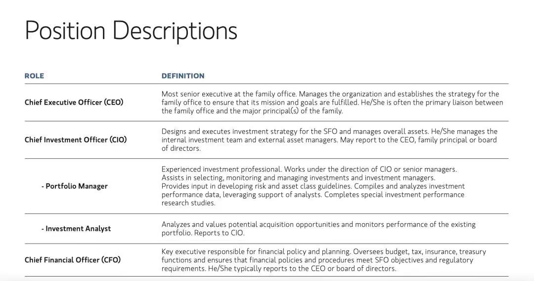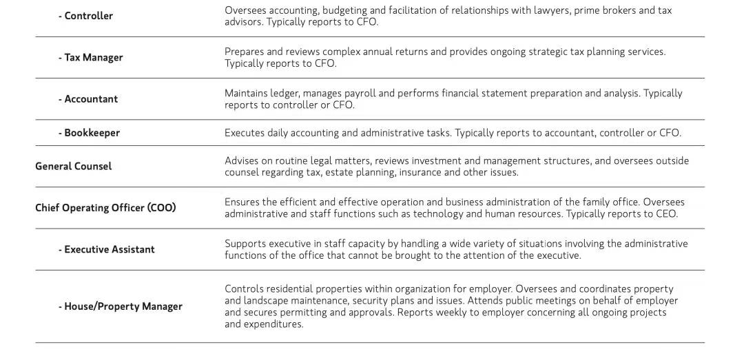 在成熟的市场中,相对成熟的家族办公室可能会设立以下主要职位: