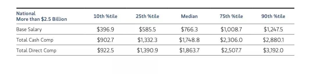 美国家族办公室首席执行官的直接薪酬总额(Total Direct Comp)通常在50万到300万美元之间,首席投资官在35万到200万美元之间,投资组合经理在25万到135万美元之间,首席财务官在30万到90万美元之间,其他职位依次下降。