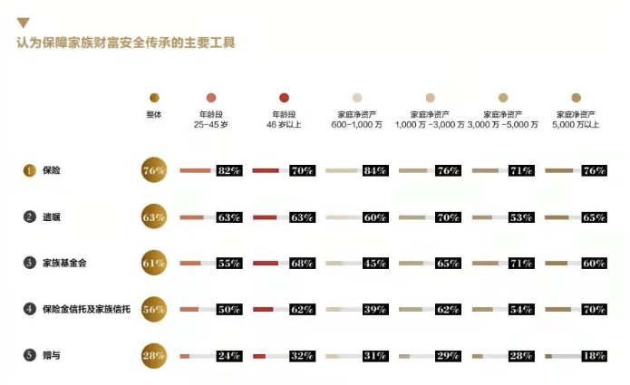 而本次报告显示,针对家族财富安全传承,高净值群体最多想到的工具仍是保险(76%),其后为遗嘱(63%)、家族基金(61%)、保险金信托及家族信托(56%),说明用保险传承财富在高净值群体中继续普及(见下图,图表来源:《中信保诚人寿「传家」·胡润百富2021中国高净值人群家族安全报告》)。