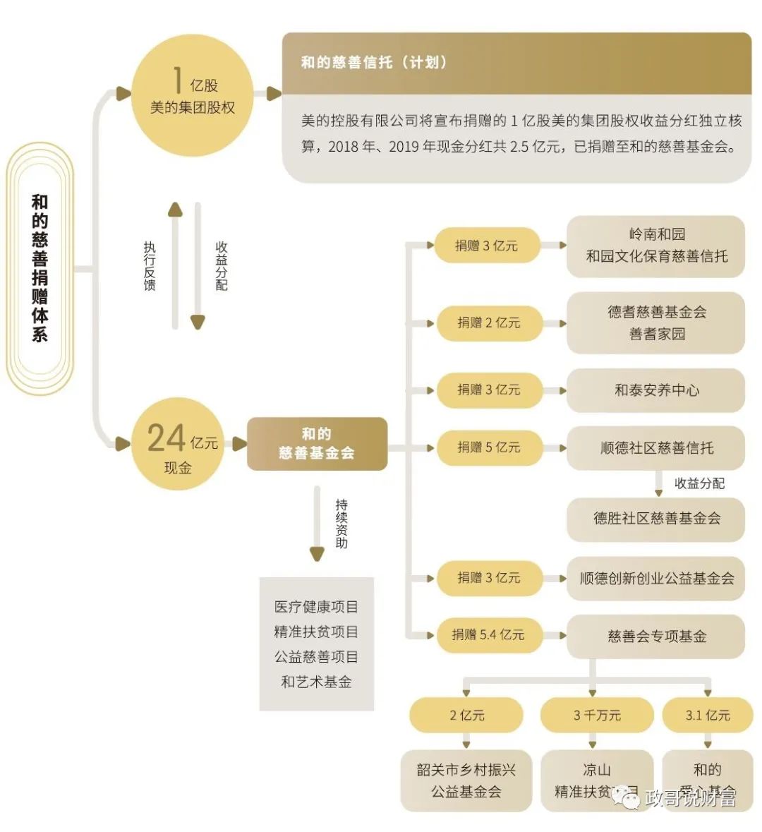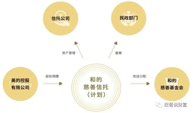 计划设立一个永续慈善信托,装入1亿股美的集团股票。由美的控股有限公司作为委托人,计划由信托公司担任受托人,信托财产及收益在全国范围内支持公益慈善事业的发展,尤其关注精准扶贫、教育和医疗等领域的慈善需求。